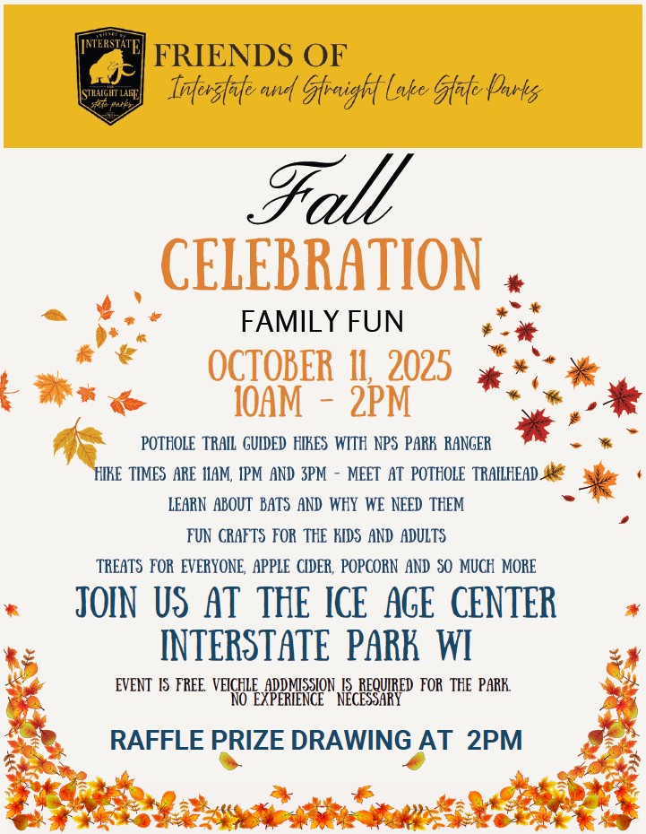 Join us at the Ice Age Center at WI Interstate Park for Family Fun on October 11 between 10:00 am and 2:00 pm.
