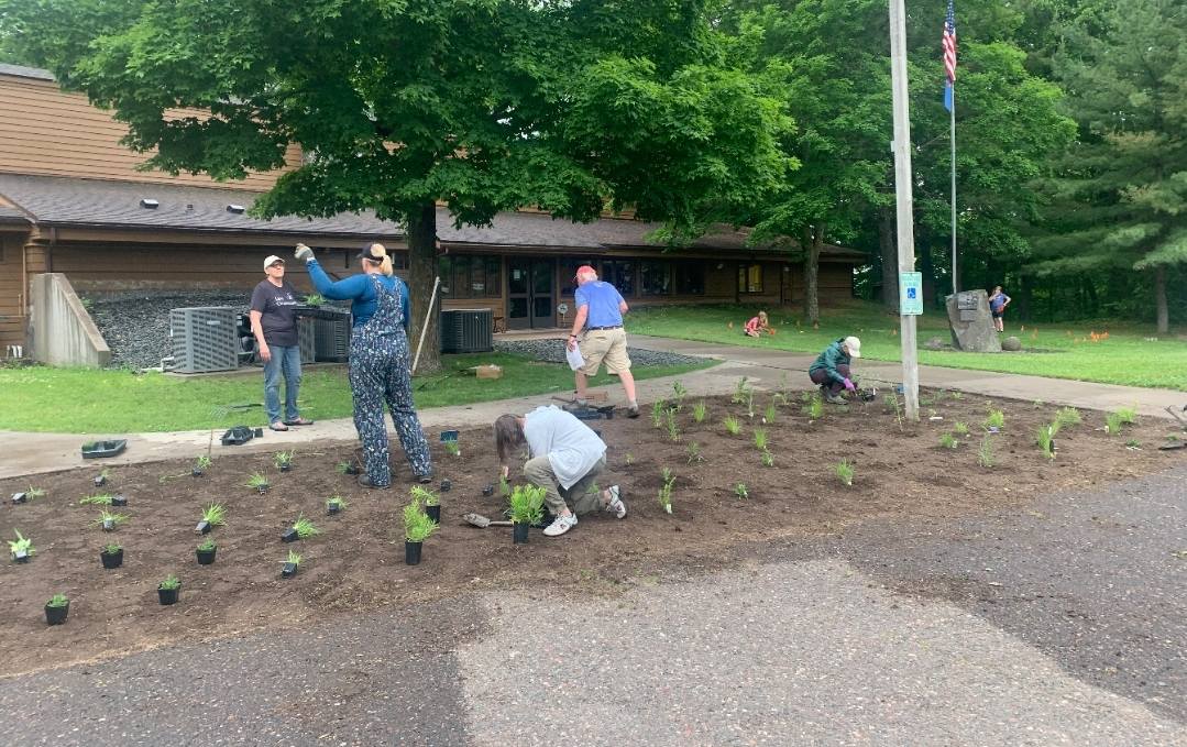 Volunteers help plant a pollinator demonstration garden in front of the Ice Age Center.